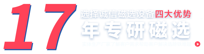 鞏義市誠信機械廠是河南省內多年生產磁選設備、永磁除鐵器和有色金屬分選設備的生產廠家,立足磁分選行業(yè)多年,致力于磁分選設備的研發(fā)和生產制造,公司主營產品有:磁選機、永磁筒式磁選機、濕式磁選機、干式磁選機、精選磁選機、小型磁選機、鈦鐵磁選機、鋼渣磁選機、石英砂磁選機、除鐵設備、永磁除鐵器、非金屬磁選機、金屬磁選機、選鐵設備、選錳設備、渦電流金屬分選機、鋁塑分選機、渦電流分選機生產線、不銹鋼分選機、鐵鋁不銹鋼分選生產線等,用于各種鐵礦粉的精選回收、選廠、鋼廠、電廠、水泥及爐渣、鋼渣、鐵渣和金屬與非金屬中磁性物質的篩選作業(yè),我們磁分選技術成熟,工藝精湛,歡迎廣大客戶到廠區(qū)實地考察。